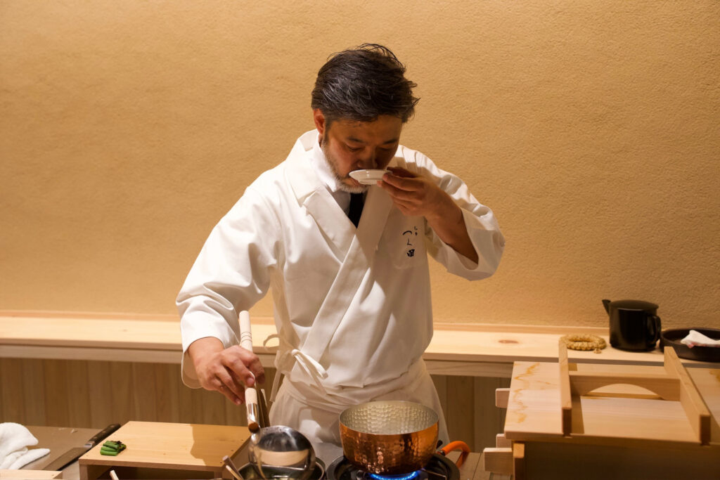 そのスープの濃度を調整し、塩で味を整えて、細かな目の特別な紙でこしたら、コラーゲンたっぷりでクリーミーな口当たりの濃厚スープが出来上がります。