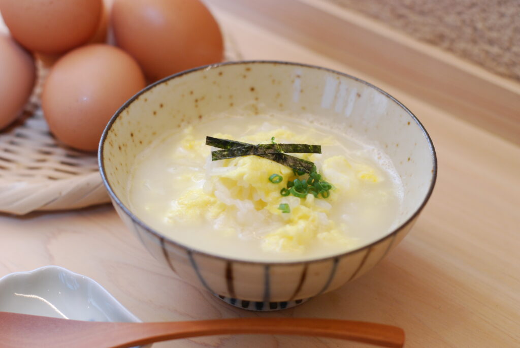 - 鍋にごはんを入れ、たまごでとじた「親子雑炊」